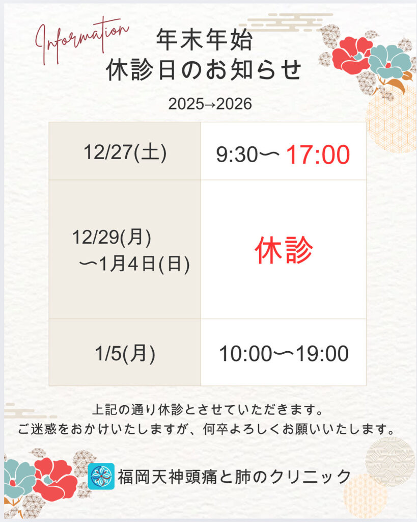 引き続き、福岡天神頭痛と肺のクリニックをどうぞよろしくお願いいたします。